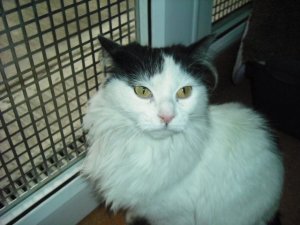 This is Masie – an adorable 4 year old female. She is white with black patches. Not a lot is known about her except she was found abandoned. She does not like to be around other cats so would need to be the only cat in the household. It’s understandable that she is nervous at first but when she becomes used to you she is a very friendly and loving lady. As you can see from the pictures she is a domestic long-haired cat and as such will need regular grooming to keep her coat in top condition.