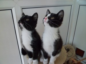 These 2 kittens are approx 6 weeks old. Petunia is a black and white female – with a white stripe down her nose. Peony is a black and white female – with a black nose. They are from the same litter and their mother is Trixie. Both are very playful and good natured as can be expected from youngsters.