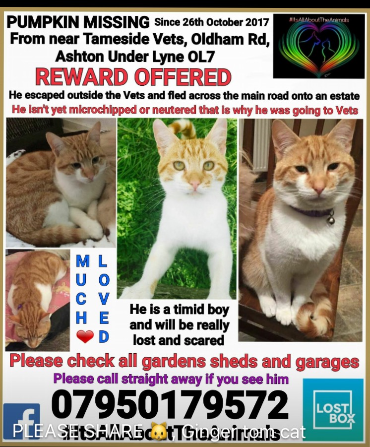 30th Oct 2017 Admin Pumpkin is lost Please see pumpkin’s poster. He is a much missed little boy. Share this: Click to share on X (Opens in new window) X Click to share on Facebook (Opens in new window) Facebook Click to share on LinkedIn (Opens in new window) LinkedIn Click to share on WhatsApp (Opens in new window) WhatsApp Click to email a link to a friend (Opens in new window) Email