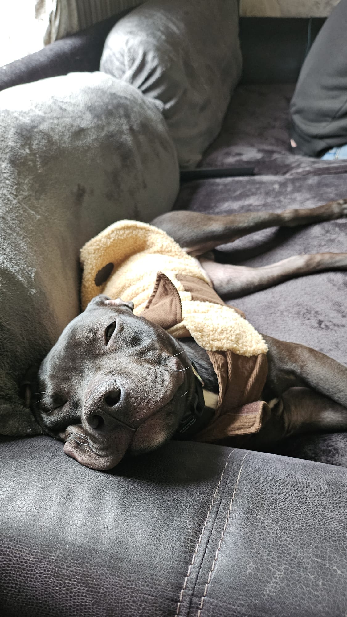 Oscar is a lovely, friendly staffie cross puppy who is now about 9 months of age. His fosterer say he’s a lovely boy who would be best as an only dog simply because he gets a bit too excited around other other dogs. He is a beautiful dog who loves everyone he meets. He loves his sleep and likes nothing better than to cuddle up with his humans and have a well deserved rest. He walks well on the lead and is brilliant with children of any age but younger ones tend to be a bit too boisterous for him.