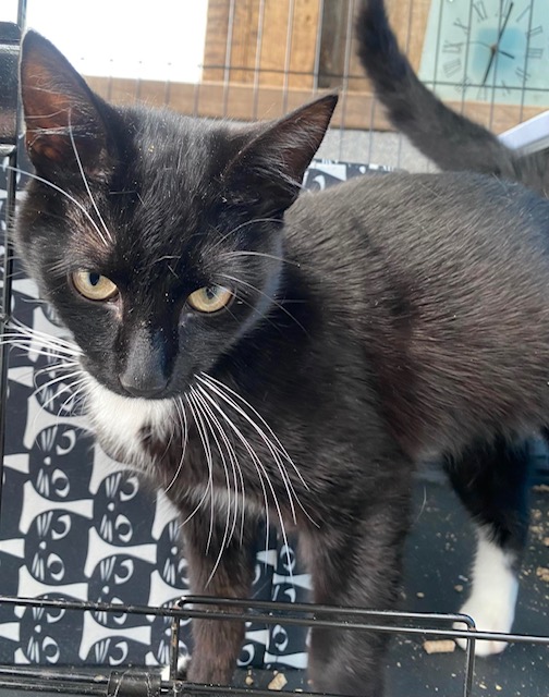 This young cat is approximately 8 months old and he is as friendly and playful as they come. He is a classic black and white cat with stunning long white whiskers.