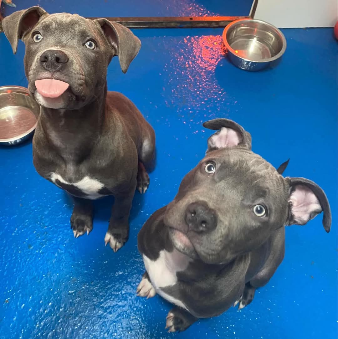 The boys were found tied up to a post and taken to one of our local veterinary practices by their worried finder. As no one came to claim them we were asked to take them into our care as a result we don’t know if they have ever lived in a home so will need to get used to all the usual household machines and toilet rules. They are friendly pups who love other dogs but may be a bit too boisterous for some who aren’t used to their staffie ways.