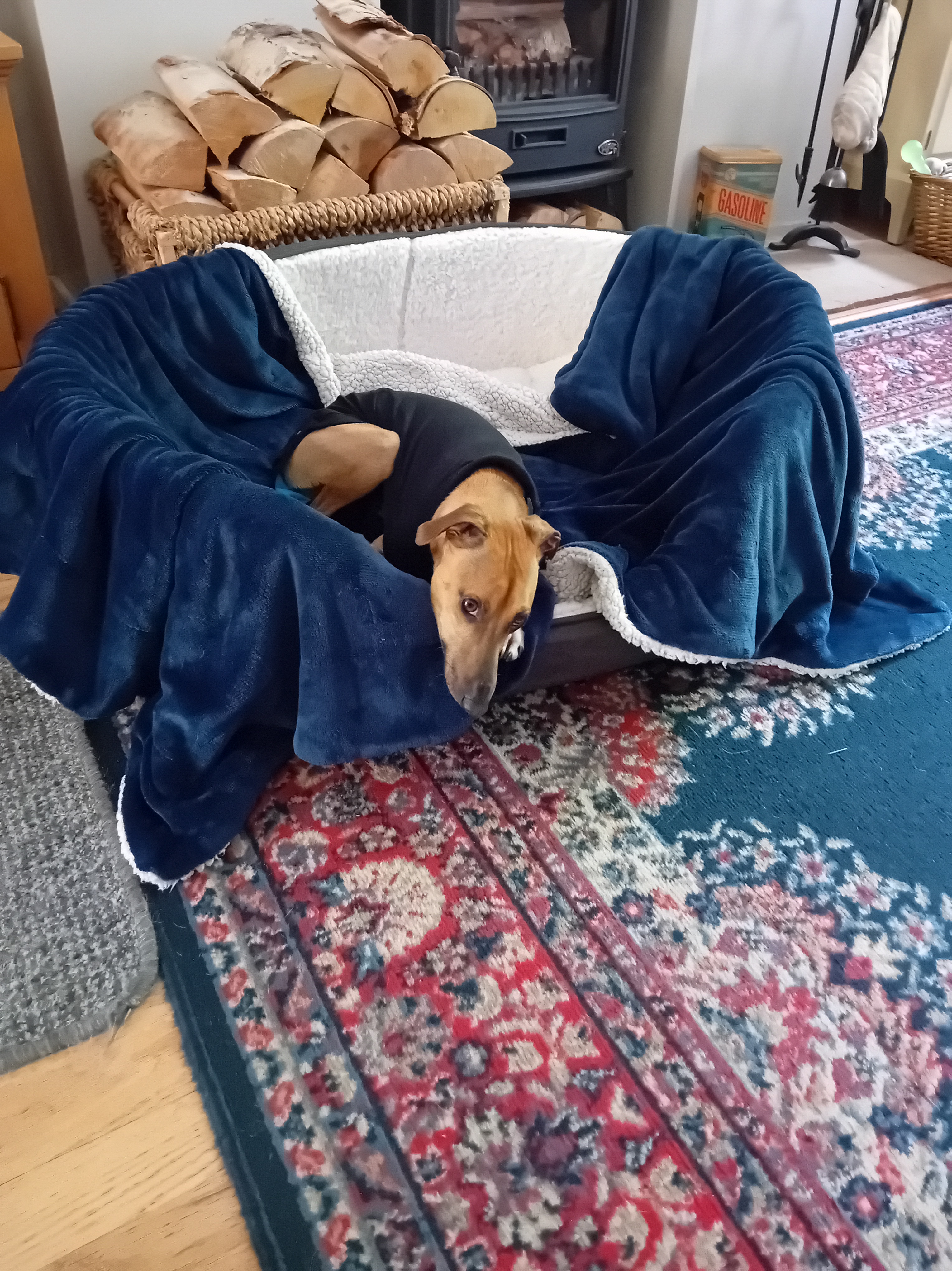 He gets on well with other dogs and would probably be much happier with an older dog who is not too old to enjoy playing and running with him and sharing a sofa.