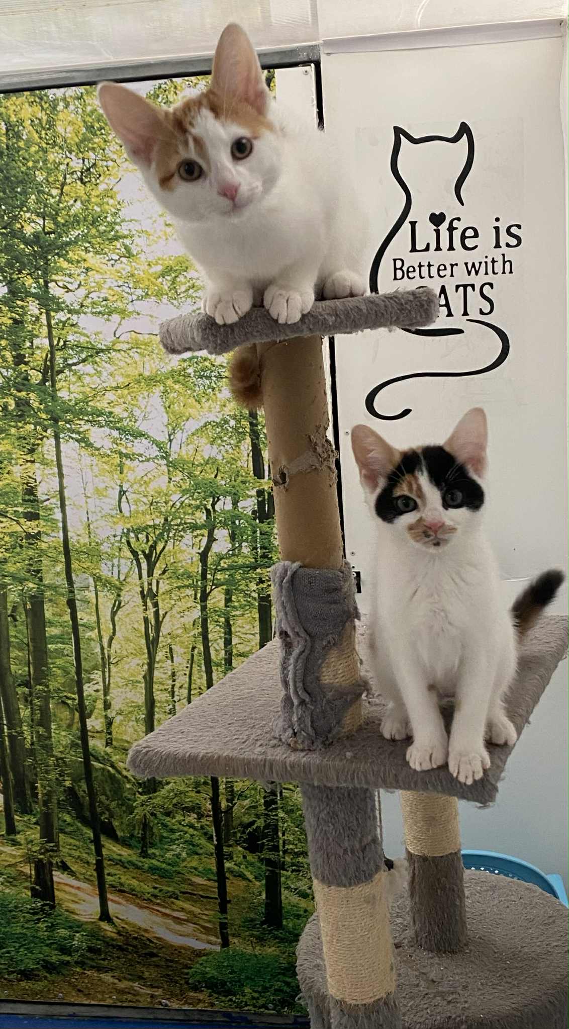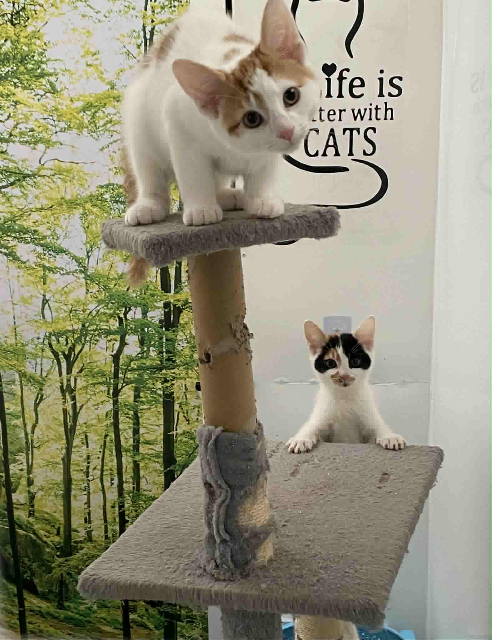 They are approximately 15 weeks old – Bubbles, the ginger & white male and Squeak, the white & tri coloured female.