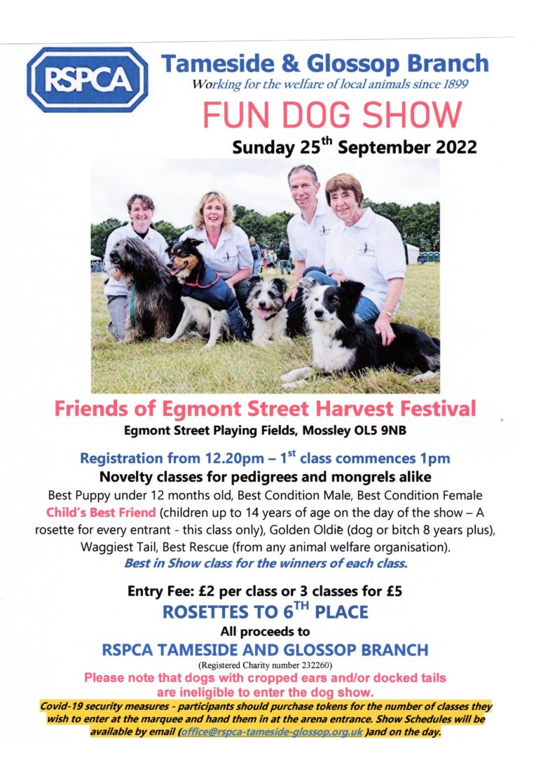 12th May – Fun Dog Show – Hollingworth Festival Wednesnough Green – Registration 12 noon – 1st Class 1pm. Everyone and their dog or dogs welcome.